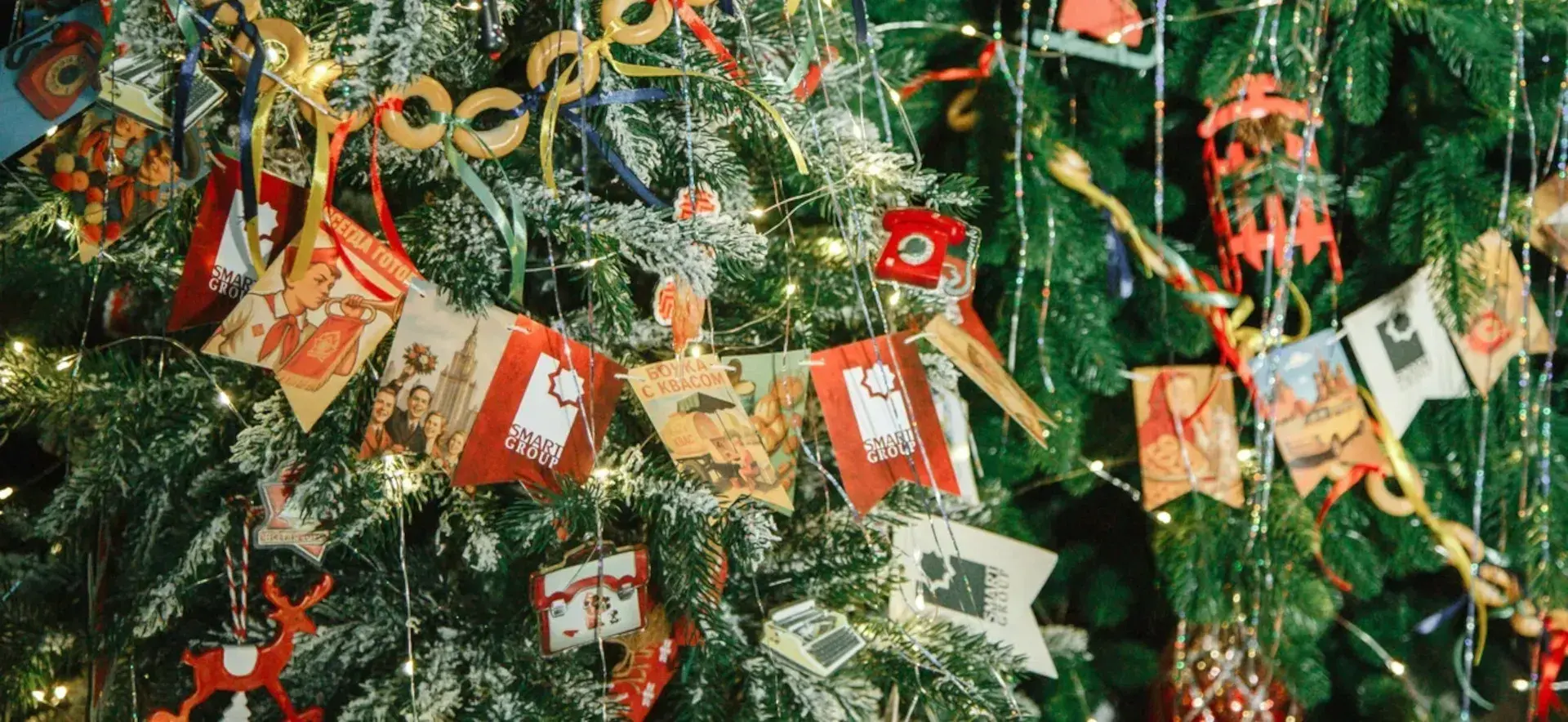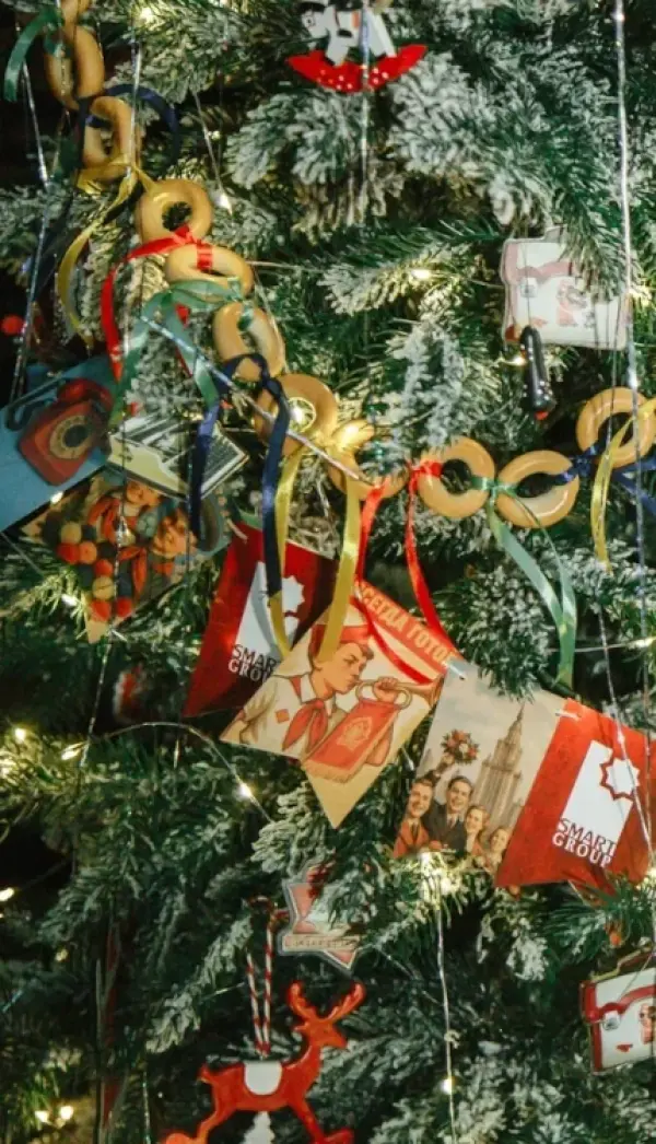 Зал был оформлен в тематике фильма «Карнавальная ночь». Пространство украсили брендированные флажки с советской символикой, новогодние композиции, красные бархатные скатерти, фигурки Щелкунчиков и советские открытки.