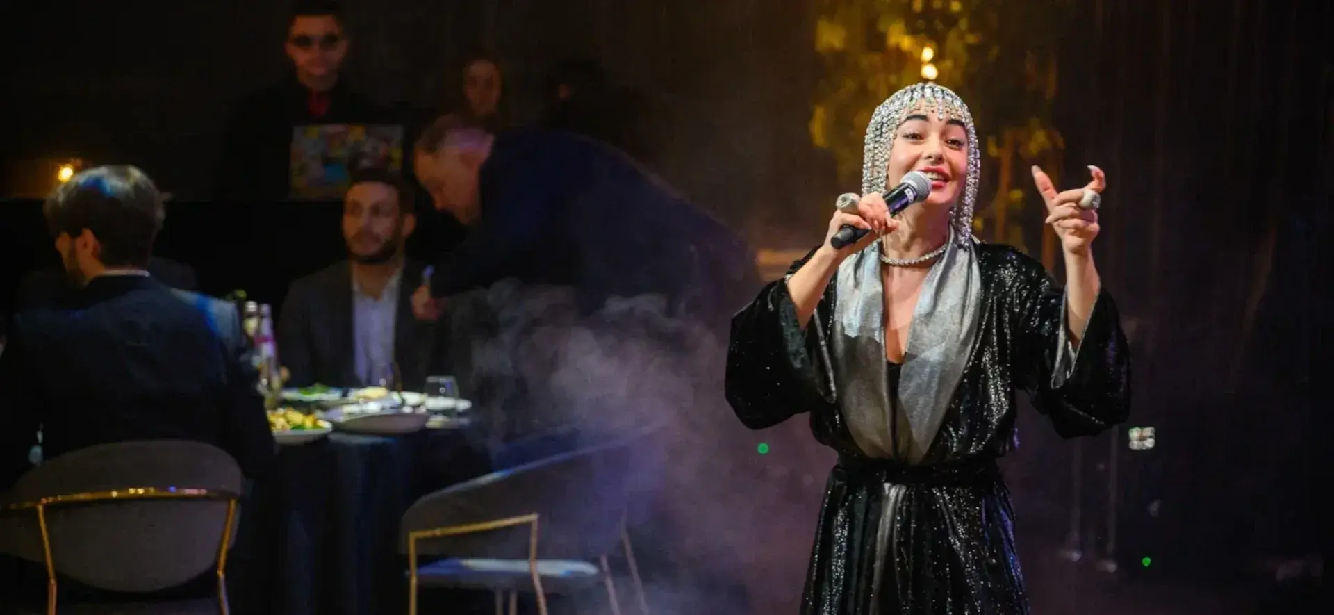 В музыкальной части вечера — живое караоке с настоящим ансамблем: контрабас, скрипка и баян. Гости исполняли любимые песни под аккомпанемент профессиональных музыкантов, превращая выступления в настоящие мини-шоу.