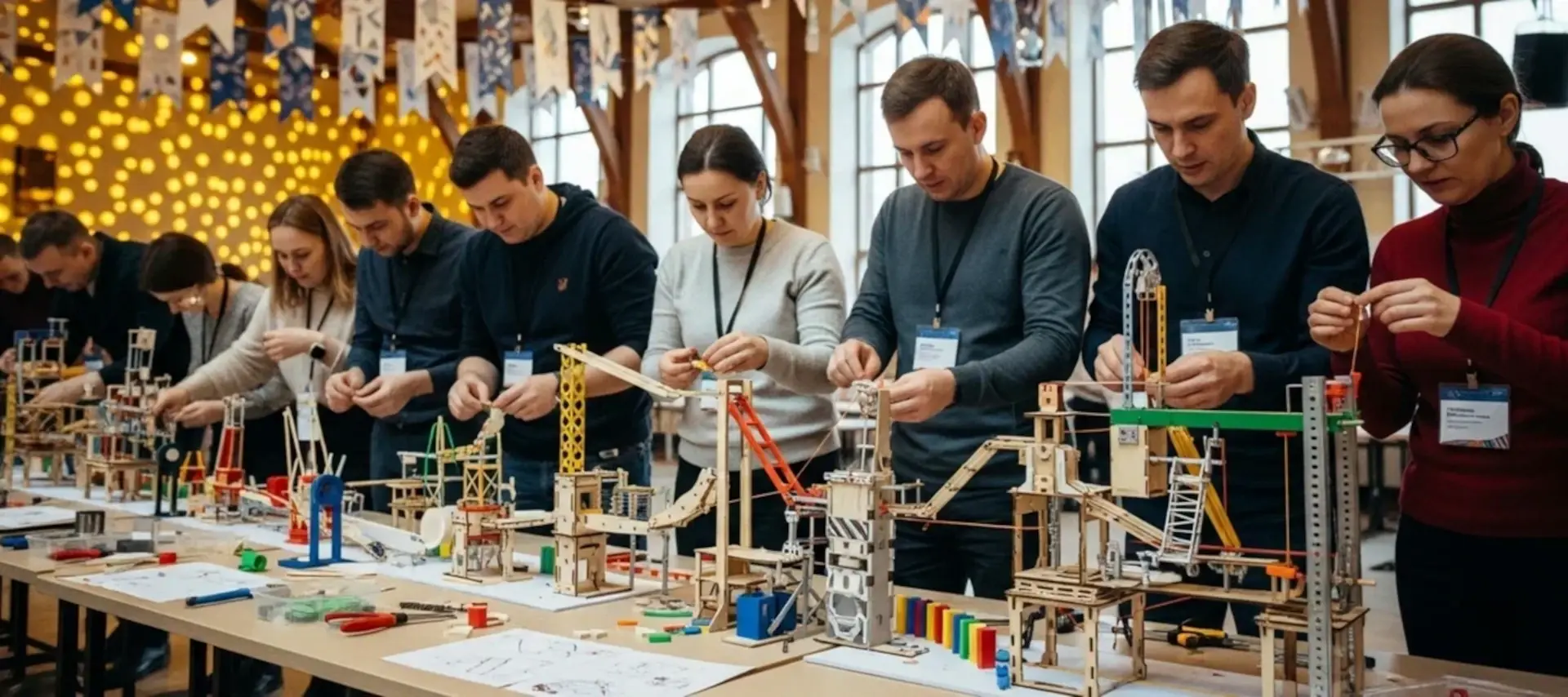 В тимбилдинге эта идея переносится с бумаги в реальность: команды собирают свои участки цепной реакции и соединяют их в один общий, но сложный механизм.