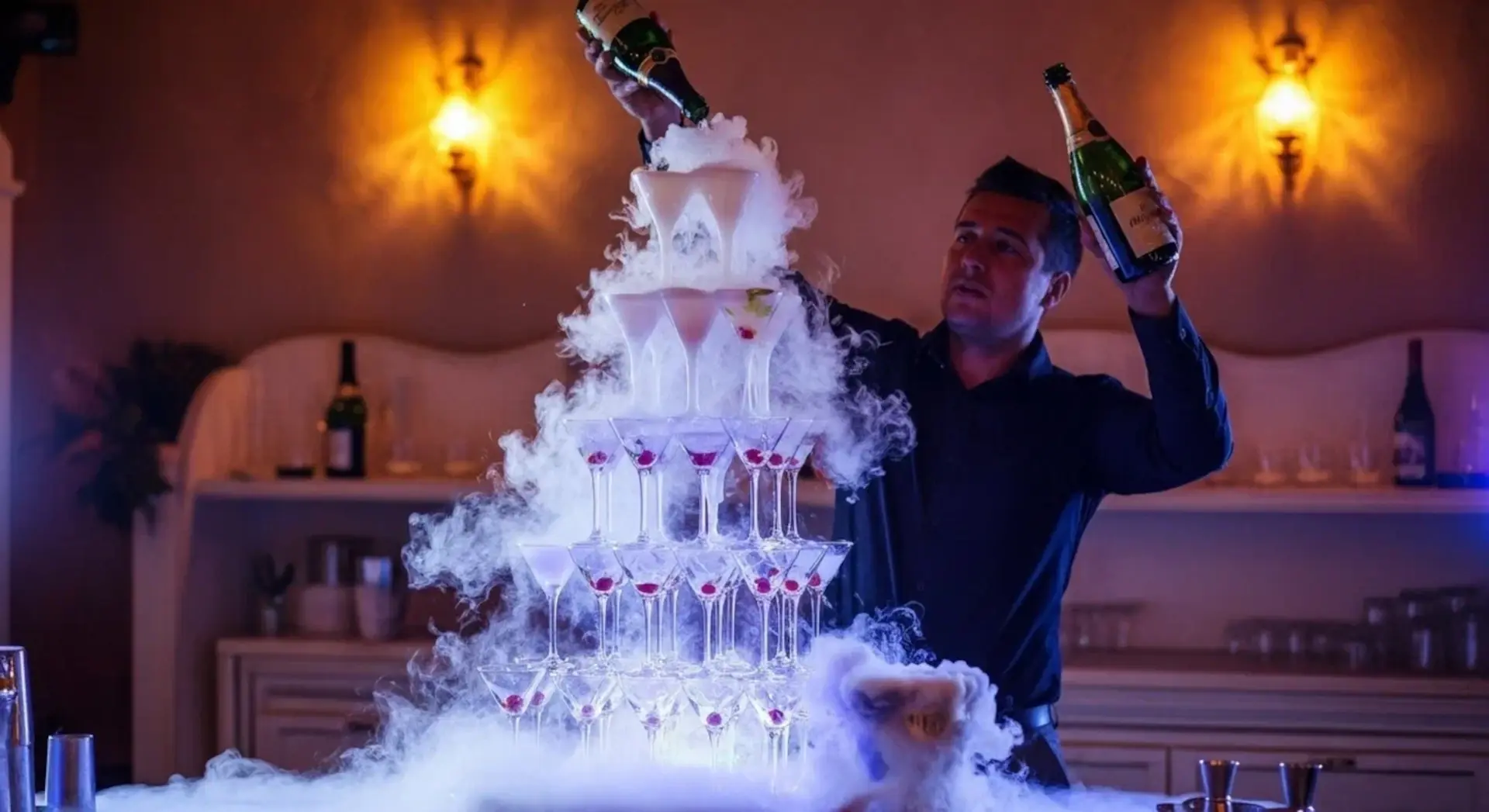 - Дополнительные опции – бармен-шоу, брендирование стойки, аренда посуды, пирамида из шампанского.